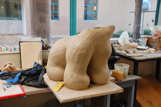 So what have I been up to this semester? Why continuing with the Polar Series of course! As you may recall, last semester in Studio Practice Class, I was essentially building 50 # test tiles in the form of Polar Bears... testing various different clay bodies & seeing how they react with the same glaze in the Soda Kiln and working out the issues in terms of drying/cracking, and finding out which clay bodies yielded results that were pleasing to me. Some worked well, and some not so much, but it gave me a great idea of where I wanted to go this semester.